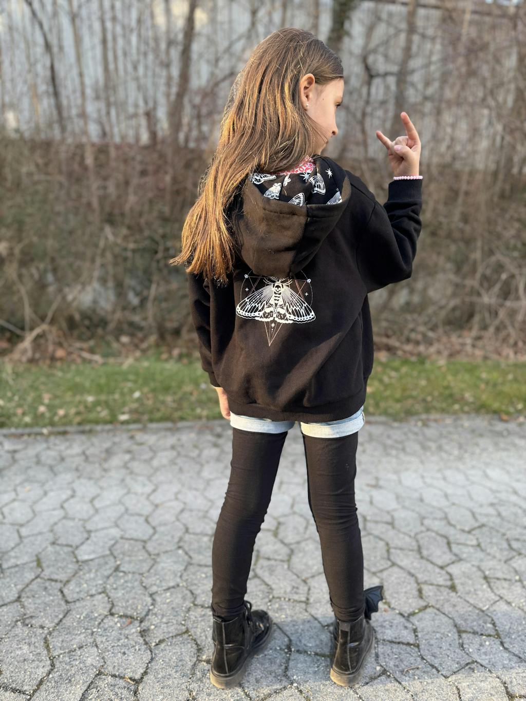 Unsere Hoodie-Jacke ist nicht einfach nur ein Kleidungsstück, sondern ein einzigartiges Statement für rockigen Style. Der schwarze Baumwollstoff, innen kuschelig weich angeraut, verspricht nicht nur Wärme, sondern auch ultimativen Komfort der dank des kinderfreundlichen Reißverschlusses jederzeit und mühelos an- und ausgezogen werden kann. Ein kleines Highlight: Die Kapuze mit unserem exklusiven Mottenstoff, der einen Hauch Rebellion in den Look bringt. Und dann unser unverwechselbares Motten-Motiv - dominant auf dem Rücken, dezent auf der Brust. Perfekt für Kids, die ihren inneren Rockstar zum Ausdruck bringen wollen.